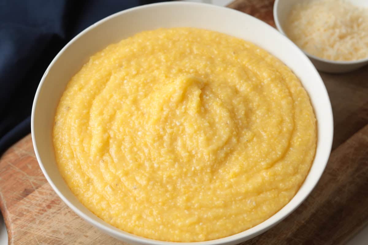 Polenta is a traditional Italian dish made from yellow cornmeal (ground corn). It is typically slow simmered in water, requiring constant stirring until it reaches a creamy or thickened texture. Polenta can be served as a soft and creamy side dish, or cooled and sliced for baking or frying.